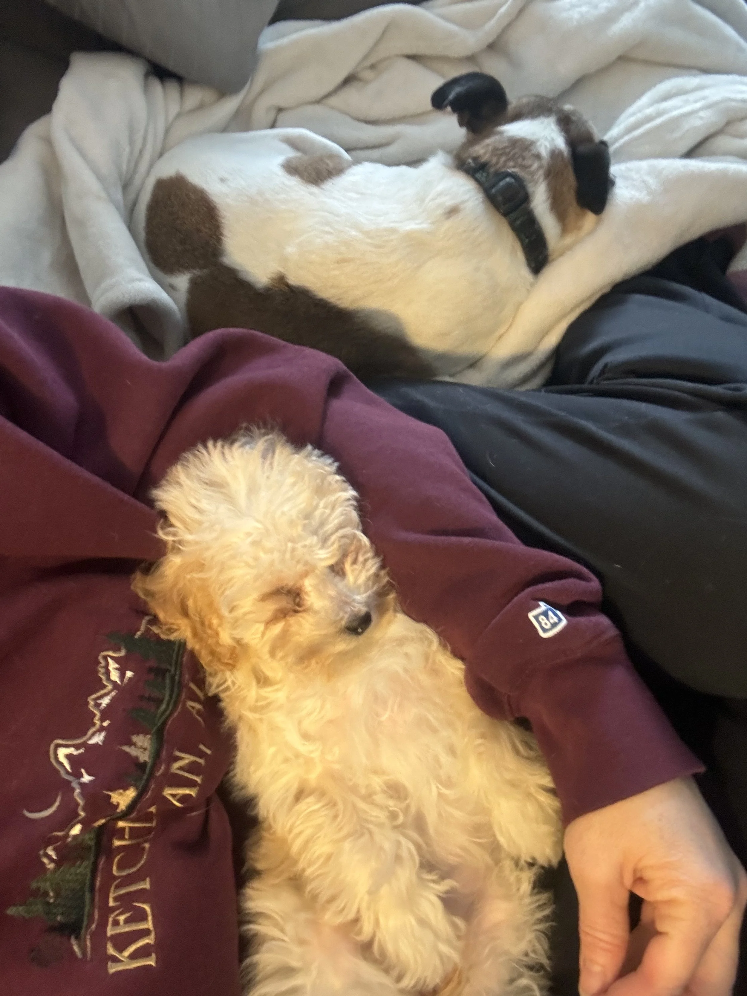 There’s puppy breath and silly zoomies and a cuddle from the snuggle bug that she is; a fresh little heartbeat beside me.